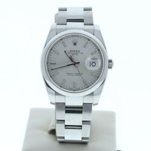Rolex 115234 Oyster Perpetual Date 34mm Watch Silver Index Dial & Fluted Bezel