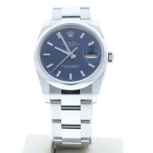 Rolex 115200 Oyster Perpetual Date 34mm Steel Watch Blue Index Dial Smooth Bezel