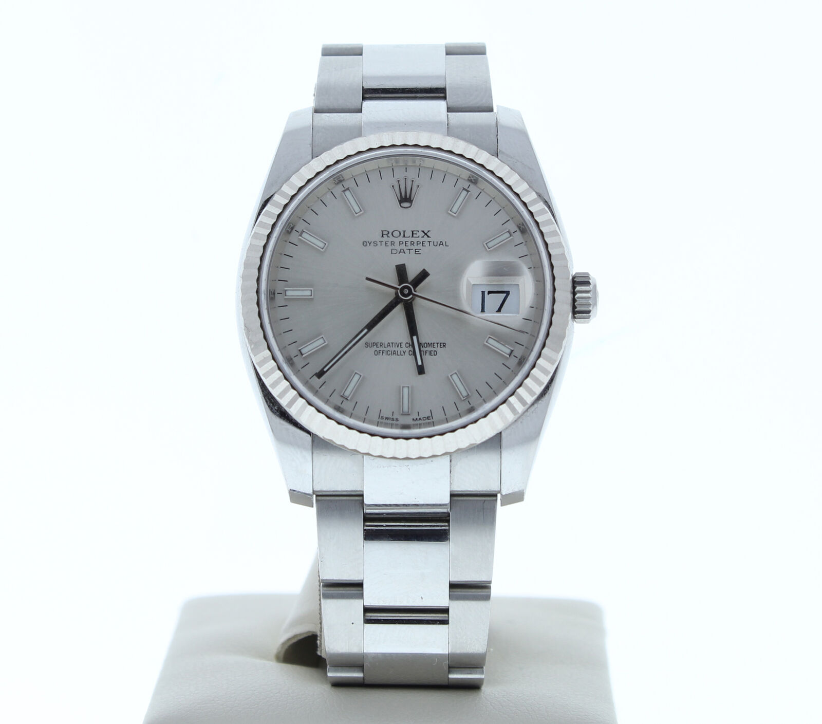 This Rolex Oyster Perpetual Date Model 115234 34mm Watch factory Silver Index Face Is in mint condition. This is a newstyle watch with a oyster heavy band that fits up to a 7 3/4″ wrist size, If you have a larger wrist please let us know and we will try to accommodate you. The watch case measures at 34mm and is designed with the newstyle deployment buckle.