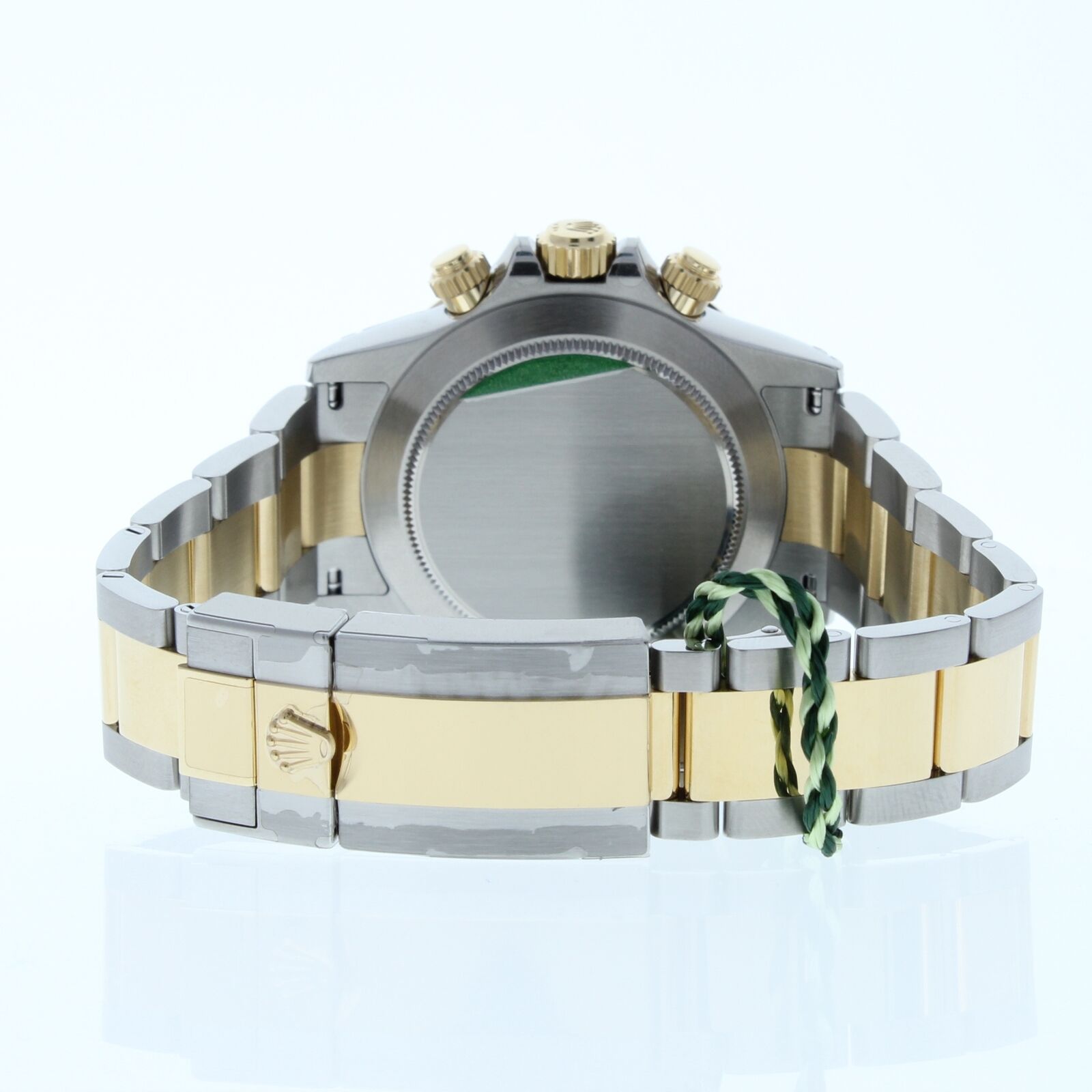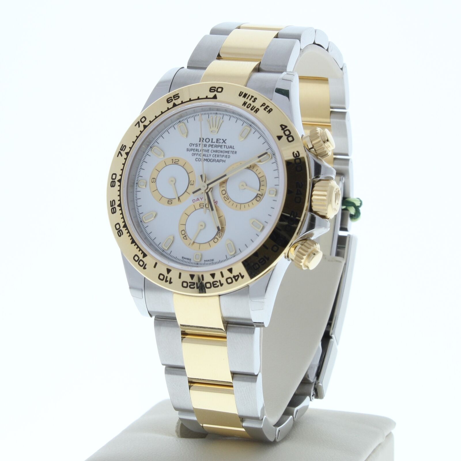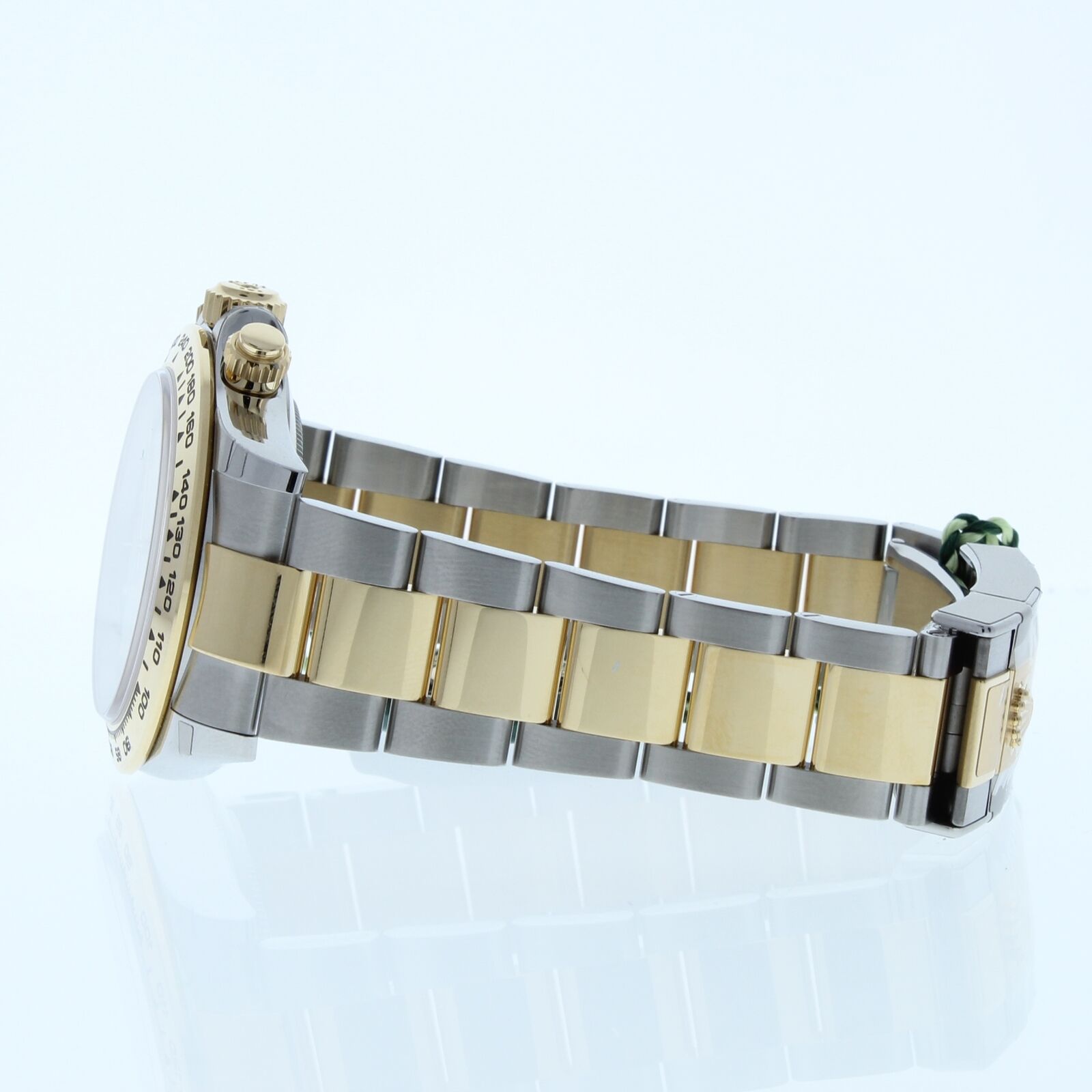 This Rolex Cosmograph Daytona Watch Is Unused With Full Stickers. It has a oyster band that fits up to a 7 3/4″ wrist size, If you have a larger wrist please let us know and we will try to accommodate you. The watch case measures at 40mm and is designed with the oyster foldover clasp.