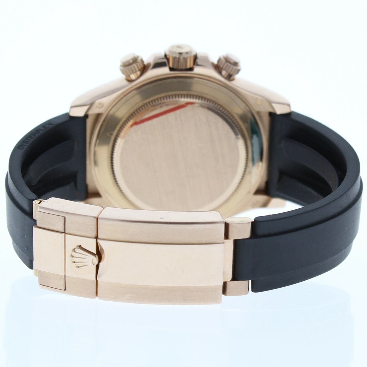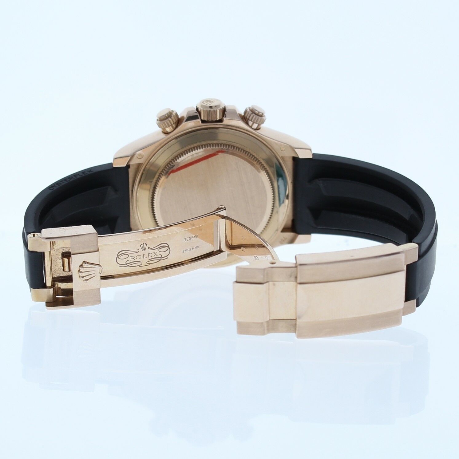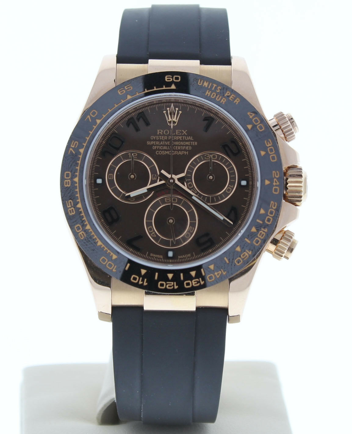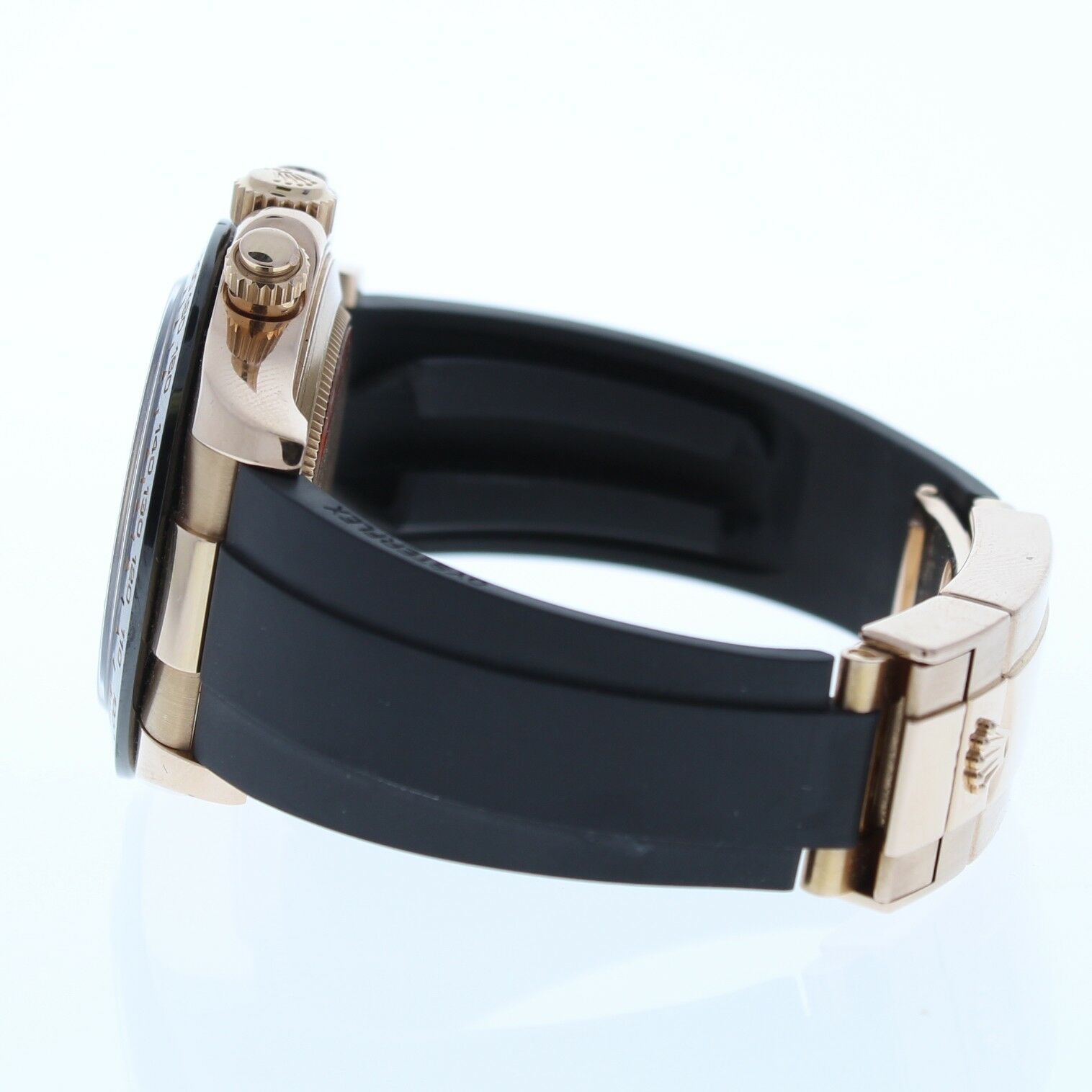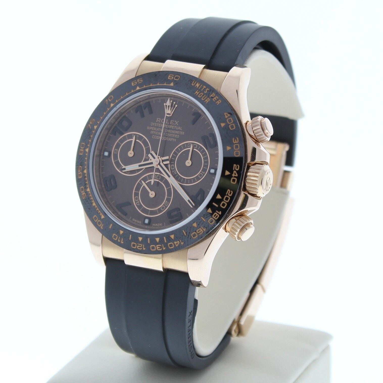 This Rolex Cosmograph Daytona 18k Rose Gold Watch Is In Excellent Condition, Zero Signs Of Wear. It Also has been tested for accuracy and water pressure. It has a Rolex Rubber Strap that fits up to a 7 3/4″ wrist size, If you have a larger wrist please let us know and we will try to accommodate you. The watch case measures at 40mm and is designed with the oyster fold over clasp.