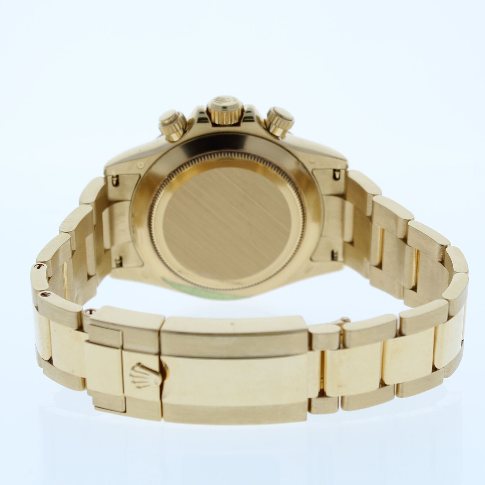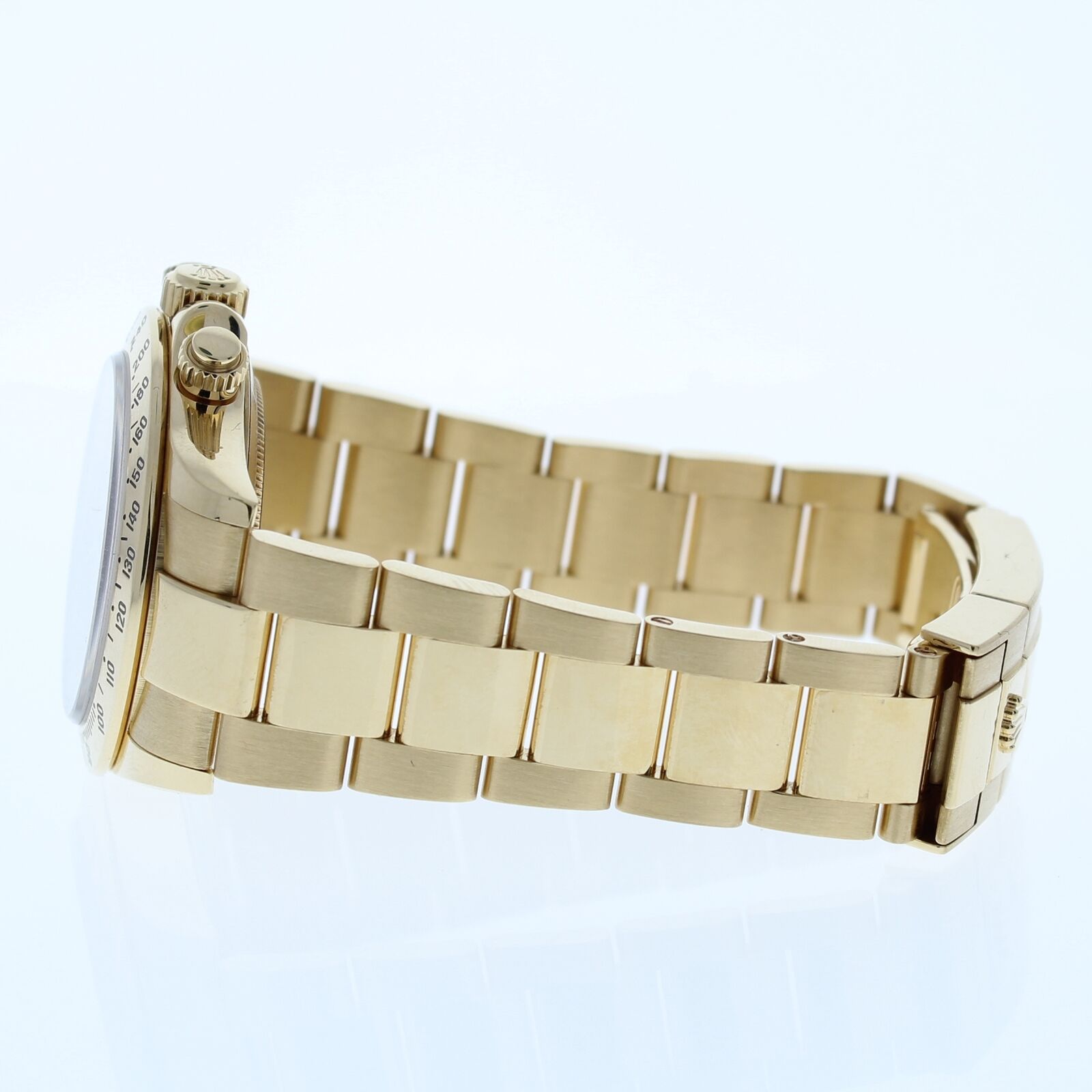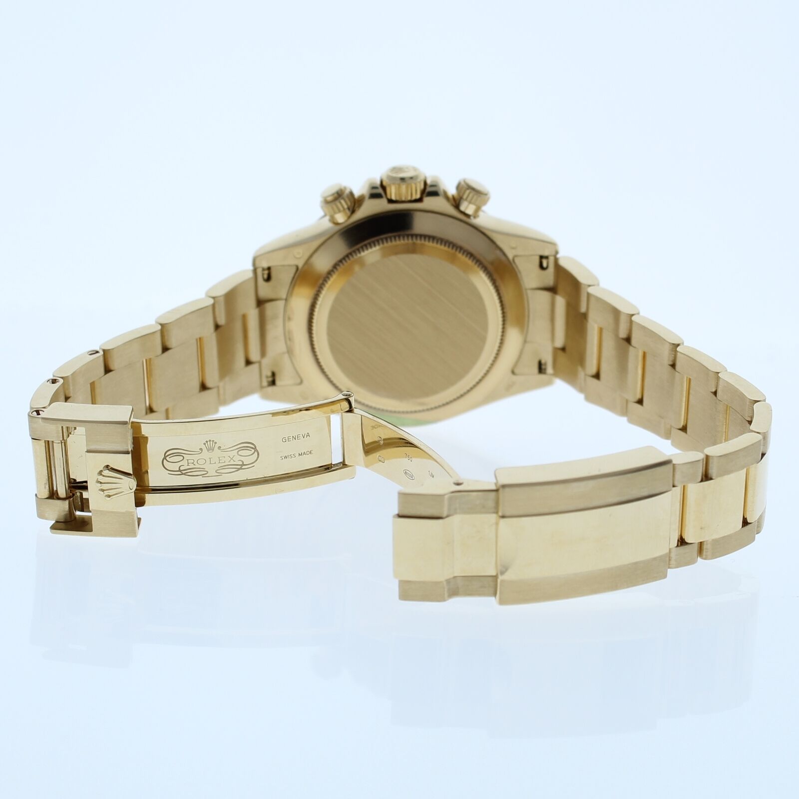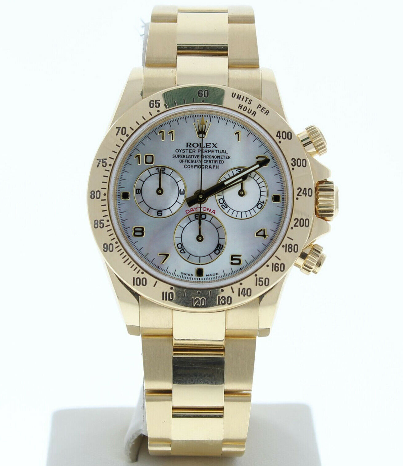 This Rolex Cosmograph Daytona 18k Yellow Gold Watch Is In Excellent Condition, Zero Scratches Or Signs Of Wear. It Also has been tested for accuracy and water pressure. It has a oyster band that fits up to a 7 3/4″ wrist size, If you have a larger wrist please let us know and we will try to accommodate you. The watch case measures at 40mm and is designed with the oyster foldover clasp.