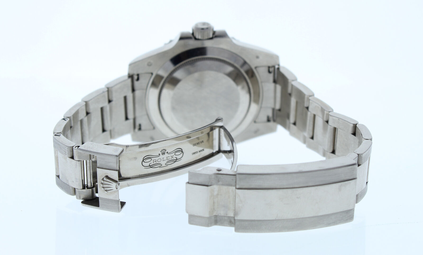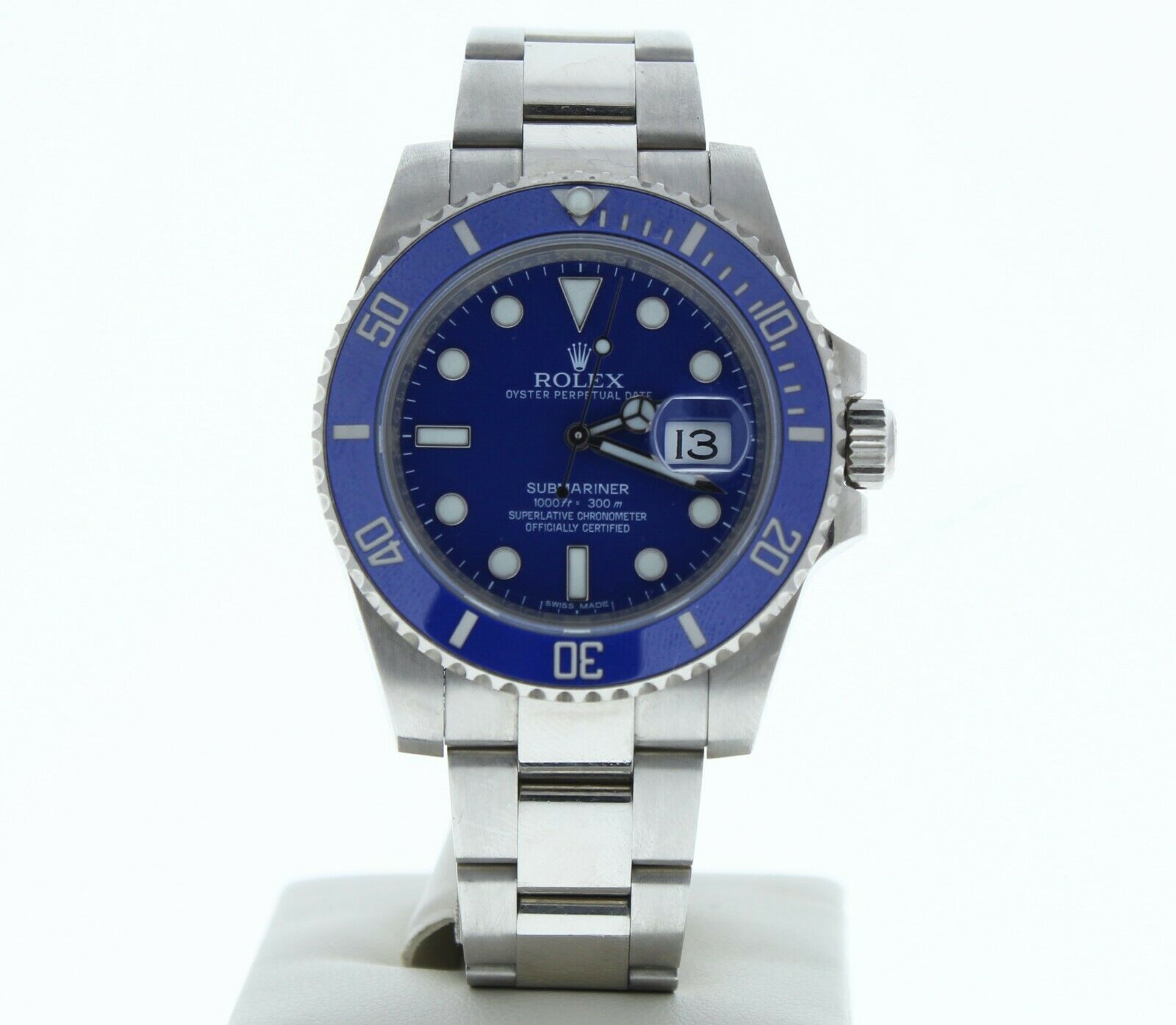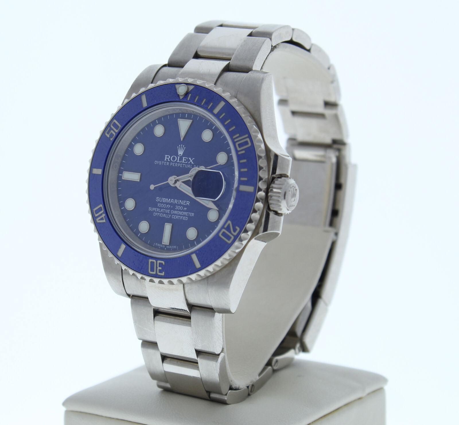 This Rolex 18k White Gold Gold Submariner Ceramic Date Watch Is In Immaculate Condition. It has a oyster band that fits up to a 7 3/4″ wrist size, If you have a larger wrist please let us know and we will try to accommodate you. The watch case measures at 40mm and is designed with the oyster foldover clasp.