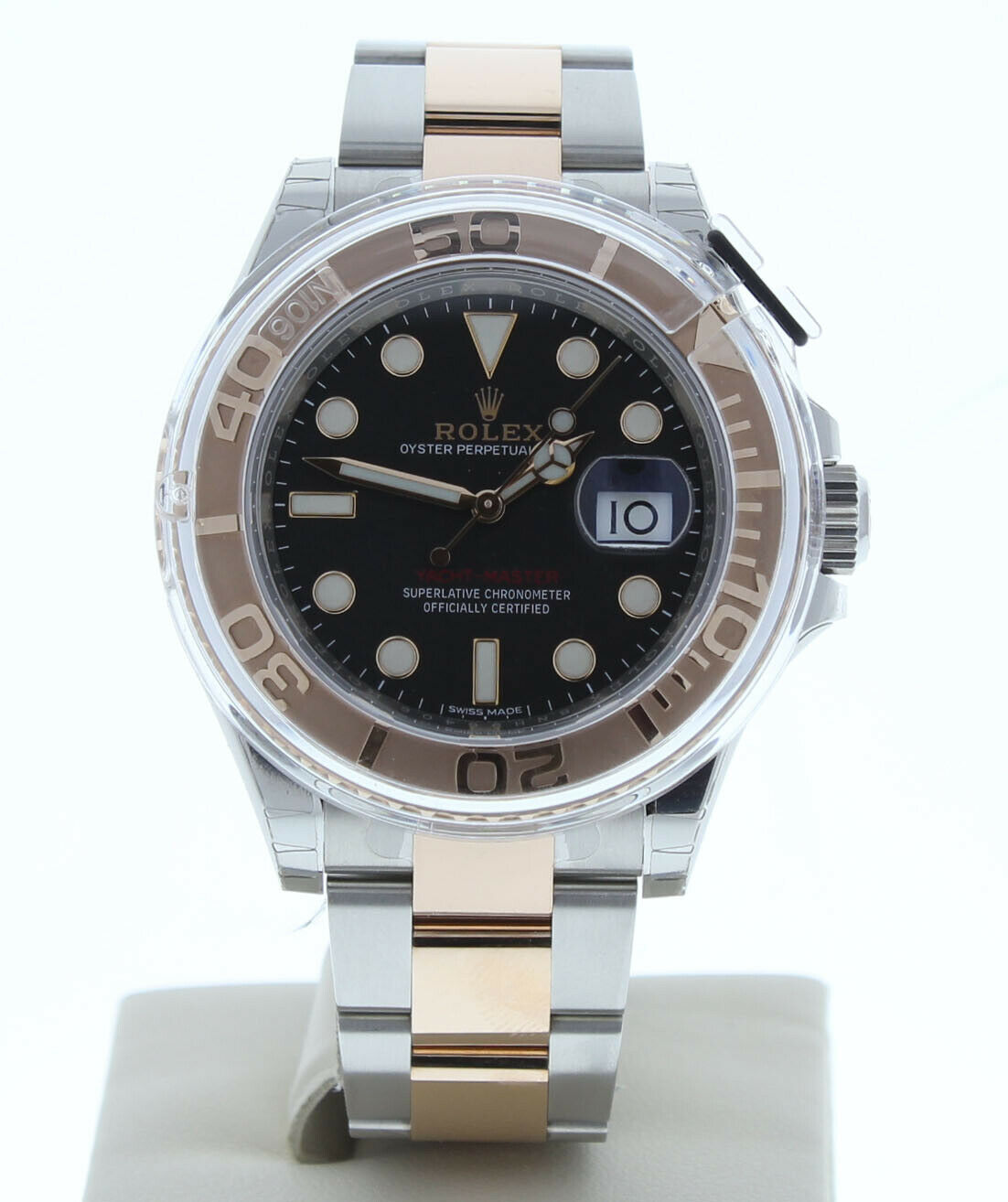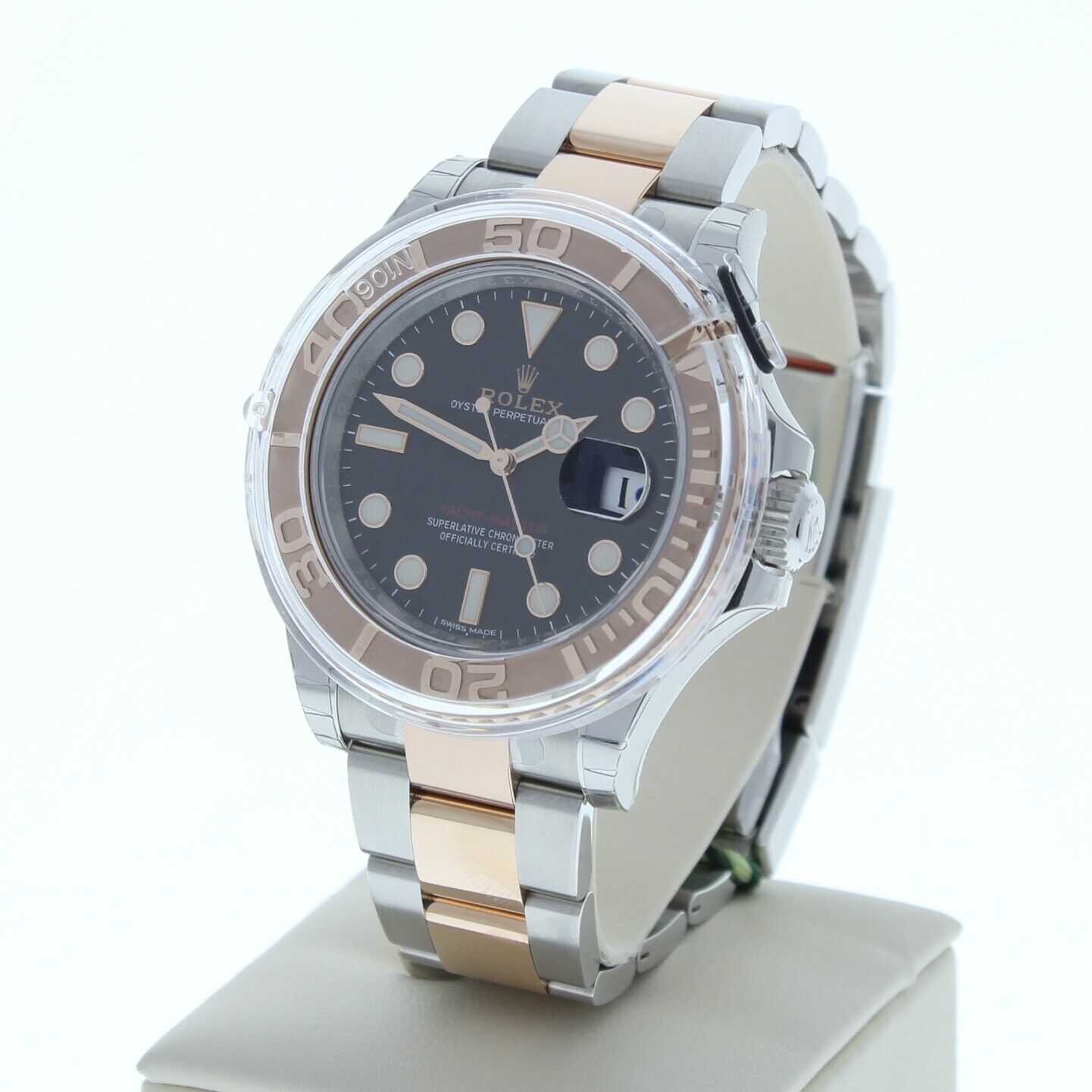 This Rolex Yachtmaster Is Unused With Full Stickers.This is a newstyle watch with a oyster heavy band that fits up to a 7 3/4″ wrist size, If you have a larger wrist please let us know and we will try to accommodate you. The watch case measures at 40mm and is designed with the oyster foldover clasp.