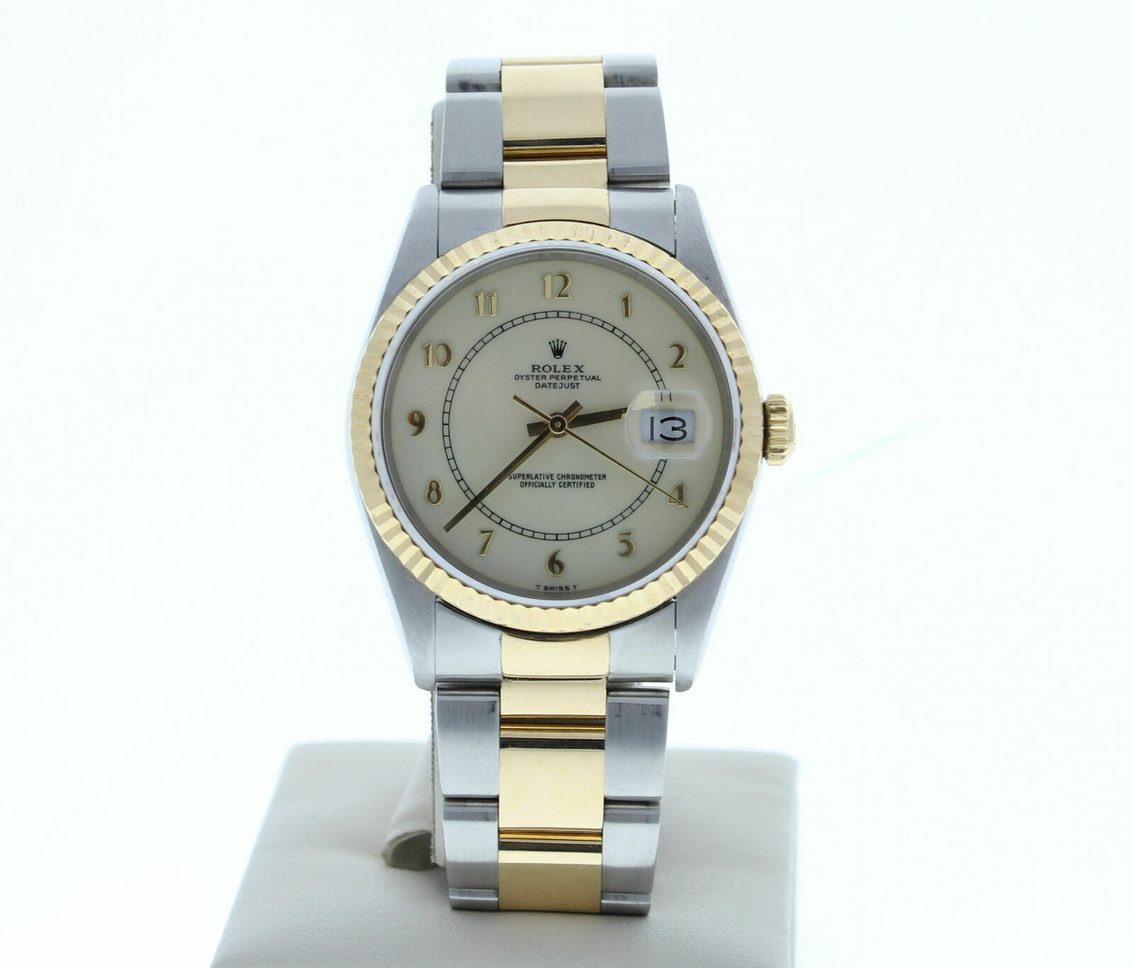 Rolex 16233 36mm Datejust Oyster Band Cream Arabic Dial & 18k Gold Fluted Bezel