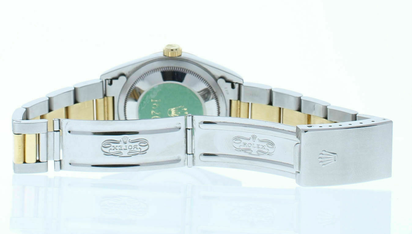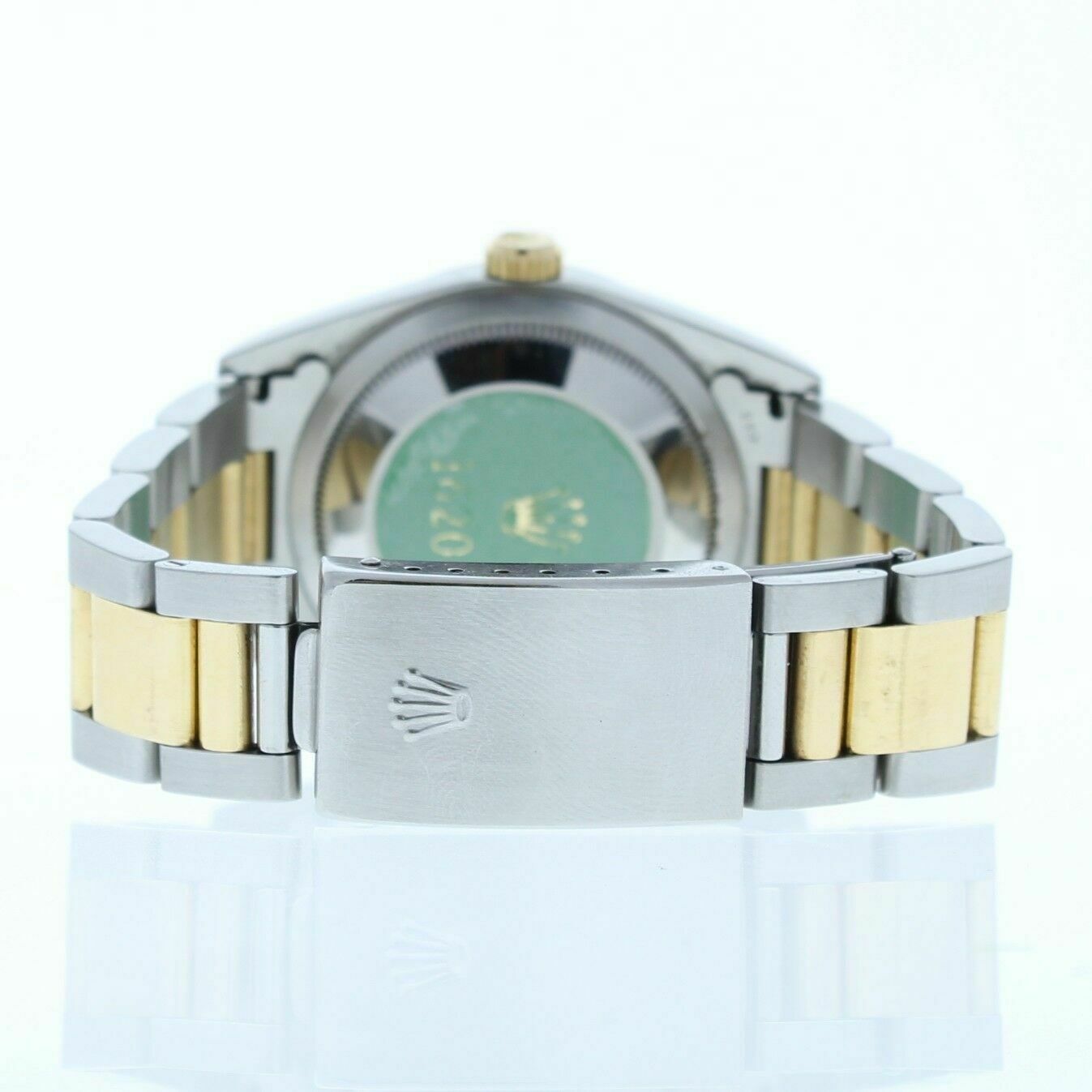 This Rolex has been beautifully restored to look brand new. This watch has been tested for accuracy and water pressure. This is a 90’s era model with a stainless steel and 18k yellow gold oyster band that can be sized up to a 7 3/4″ wrist size, If you have a larger wrist please let us know and we will try to accommodate you. The watch case measures at 36mm and comes with a deployment buckle. If you have any questions at all please feel free to contact us . We reply to all emails within 24 hours during business days.