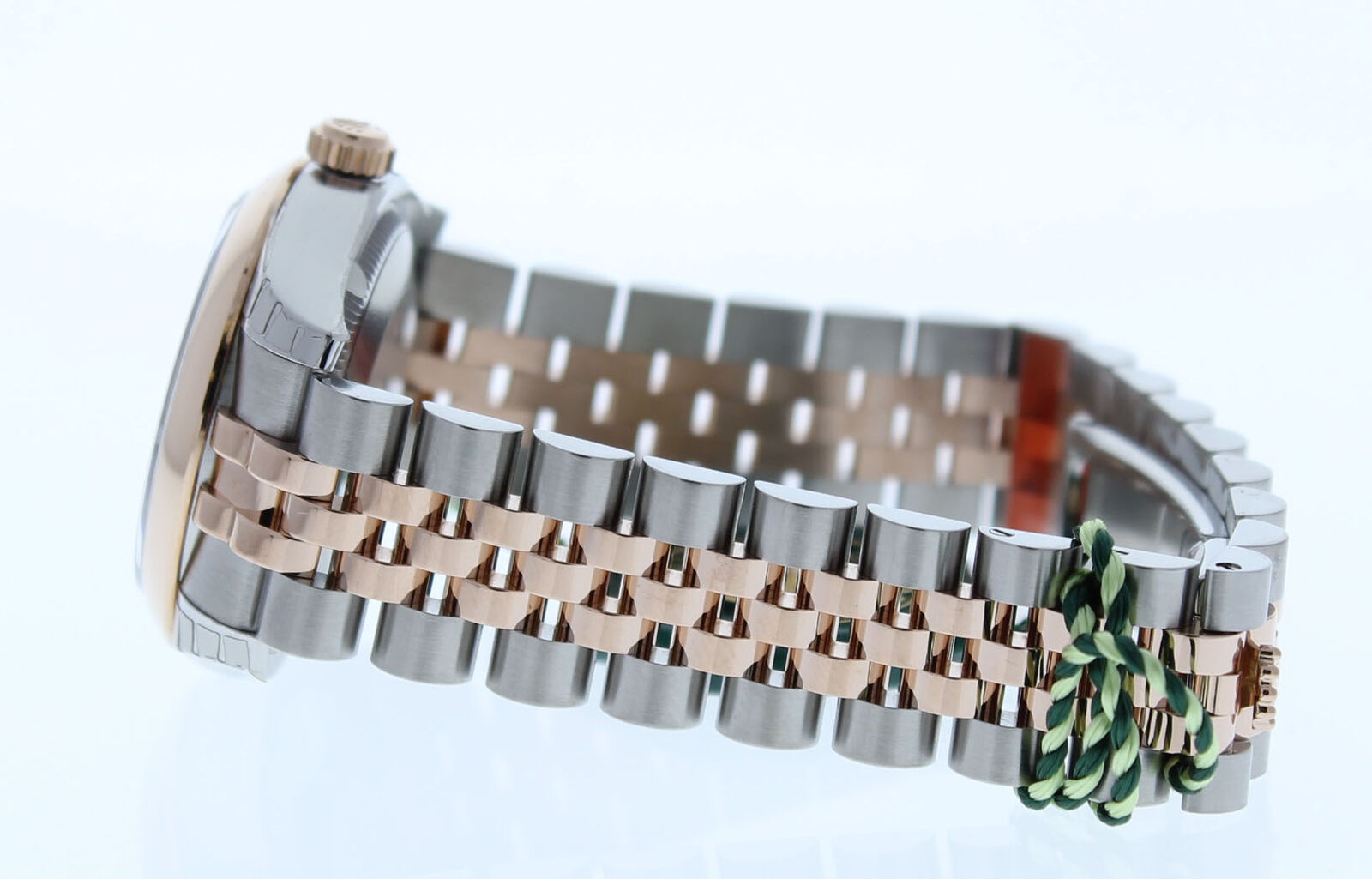 This Rolex 31mm midsize datejust has never been worn (has full stickers). This watch is currently being manufactured today, it has a newstyle stainless steel & 18k rose gold jubilee band that can be sized up to a 6 3/4″ wrist size, If you have a larger wrist please let us know and we will try to accommodate you. The watch case measures at 31mm and comes with a deployment buckle. If you have any questions at all please feel free to contact us . We reply to all emails within 24 hours during business days.