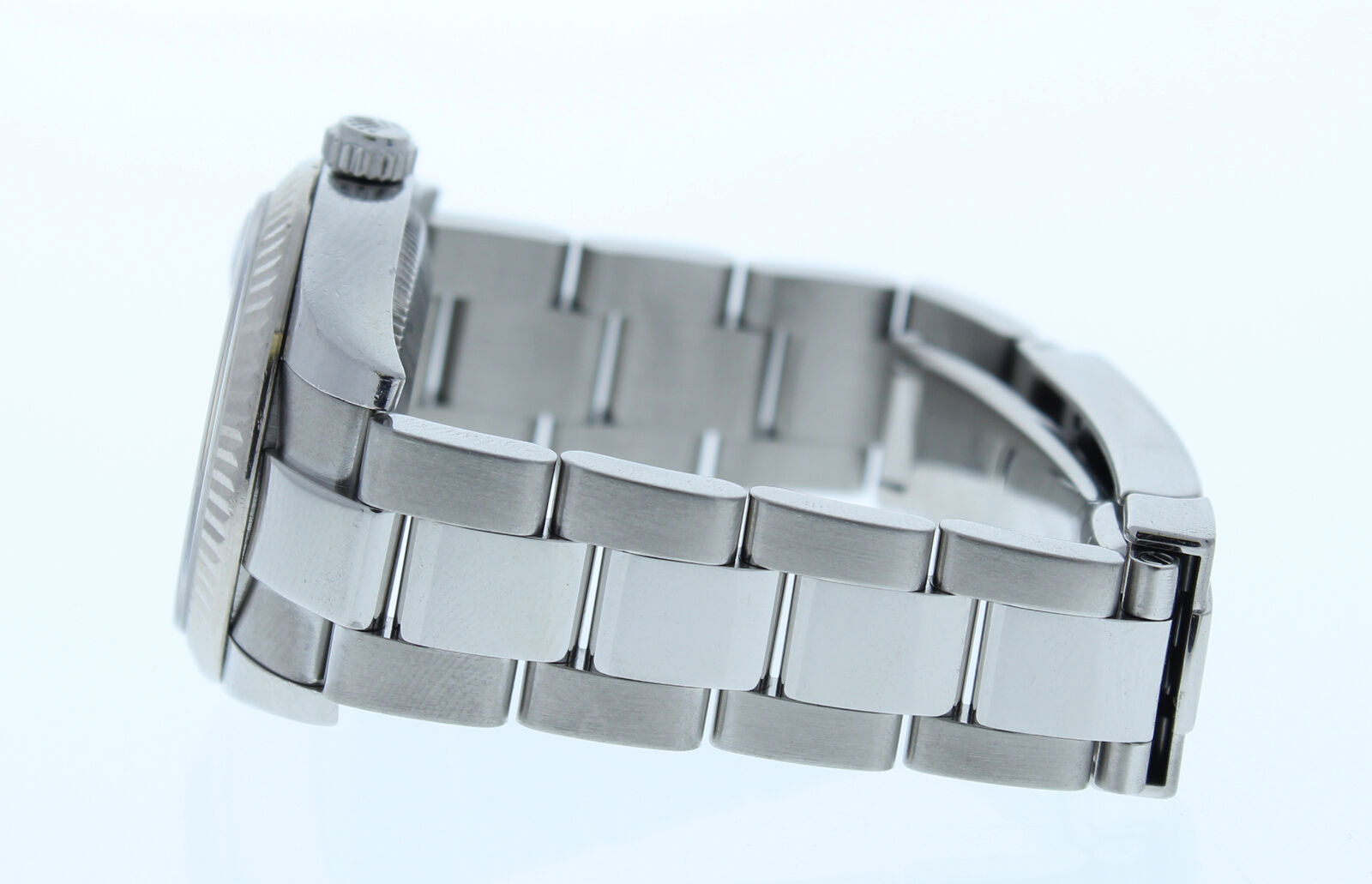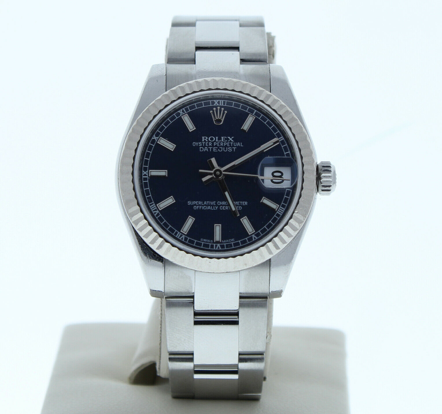 Rolex 178274 31mm Datejust Watch Oyster Band Blue Index & 18k Gold Fluted Bezel it has a new style stainless steel oyster band that can be sized up to a 6 3/4″ wrist size, If you have a larger wrist please let us know and we will try to accommodate you. The watch case measures at 31mm and comes with a deployment buckle. This Rolex has been beautifully restored to look brand new. This watch has been tested for accuracy and water pressure. This watch is currently being manufactured today.