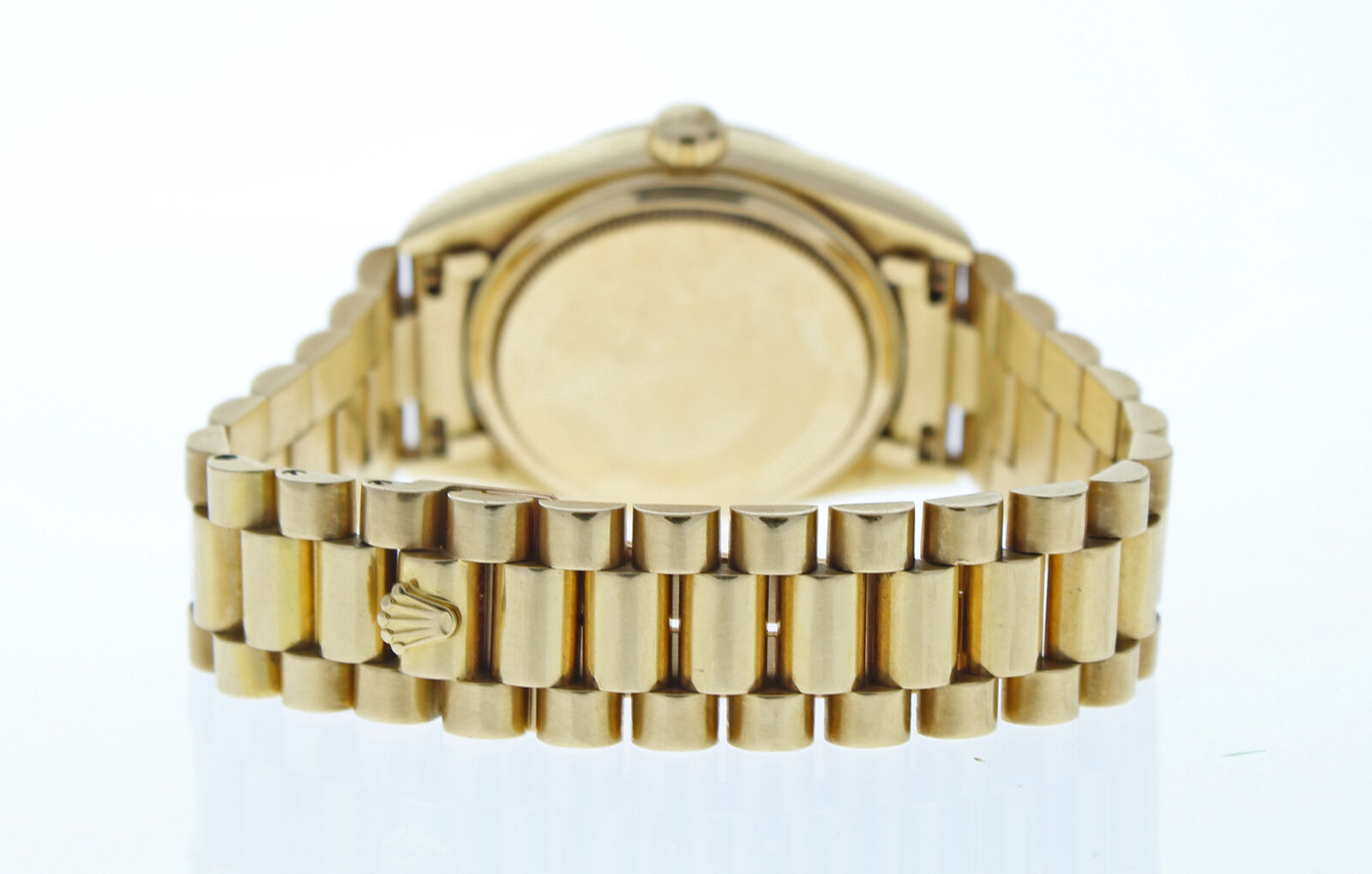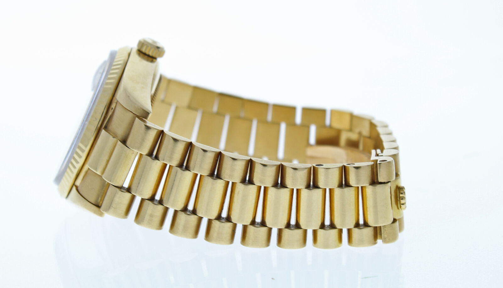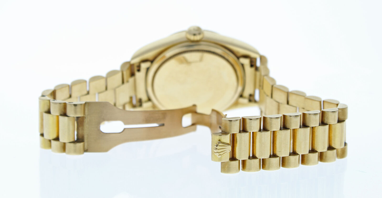 This Rolex Day Date President Watch Is Mint Condition. This watch has been tested for accuracy and water pressure. This is a 1980’s model with a 18k yellow gold presidential band that can be sized up to a 7 3/4″ wrist size, If you have a larger wrist please let us know and we will try to accommodate you. The watch case measures at 36mm and comes with a deployment buckle. If you have any questions at all please feel free to contact us . We reply to all emails within 24 hours during business days.