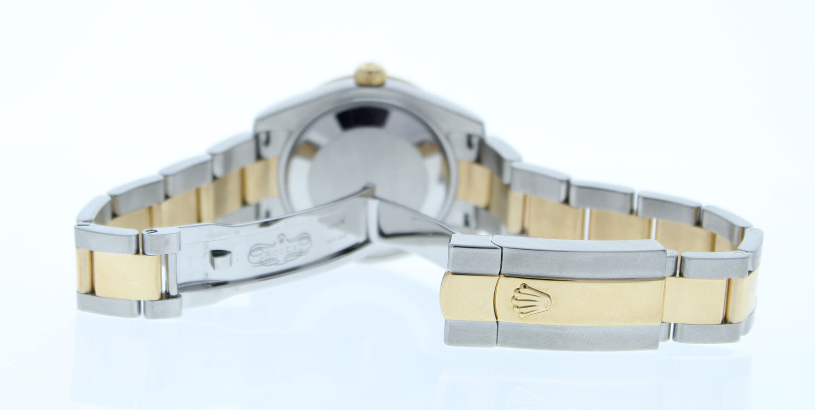 This Rolex has been beautifully restored to look brand new. This watch has been tested for accuracy and water pressure. This watch is currently being manufactured today, it has a newstyle stainless steel & 18k yellow gold oyster band that can be sized up to a 6 3/4″ wrist size, If you have a larger wrist please let us know and we will try to accommodate you. The watch case measures at 31mm and comes with a deployment buckle. If you have any questions at all please feel free to contact us . We reply to all emails within 24 hours during business days.