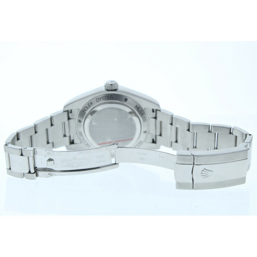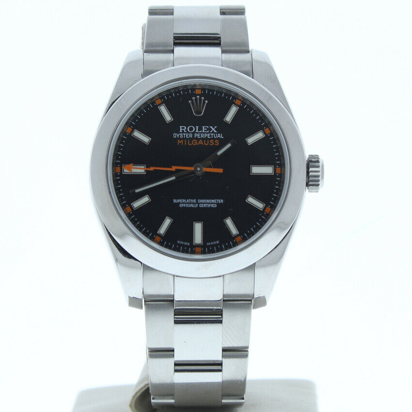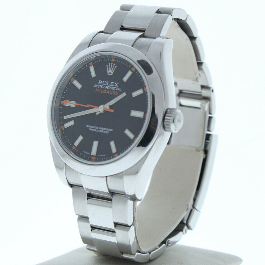 This Rolex Milgauss Is A Newstyle Watch In Mint Condition. It has a newstyle stainless steel oyster band that can be sized up to a 7 3/4″ wrist size, If you have a larger wrist please let us know and we will try to accommodate you. The watch case measures at 40mm and comes with a deployment buckle.