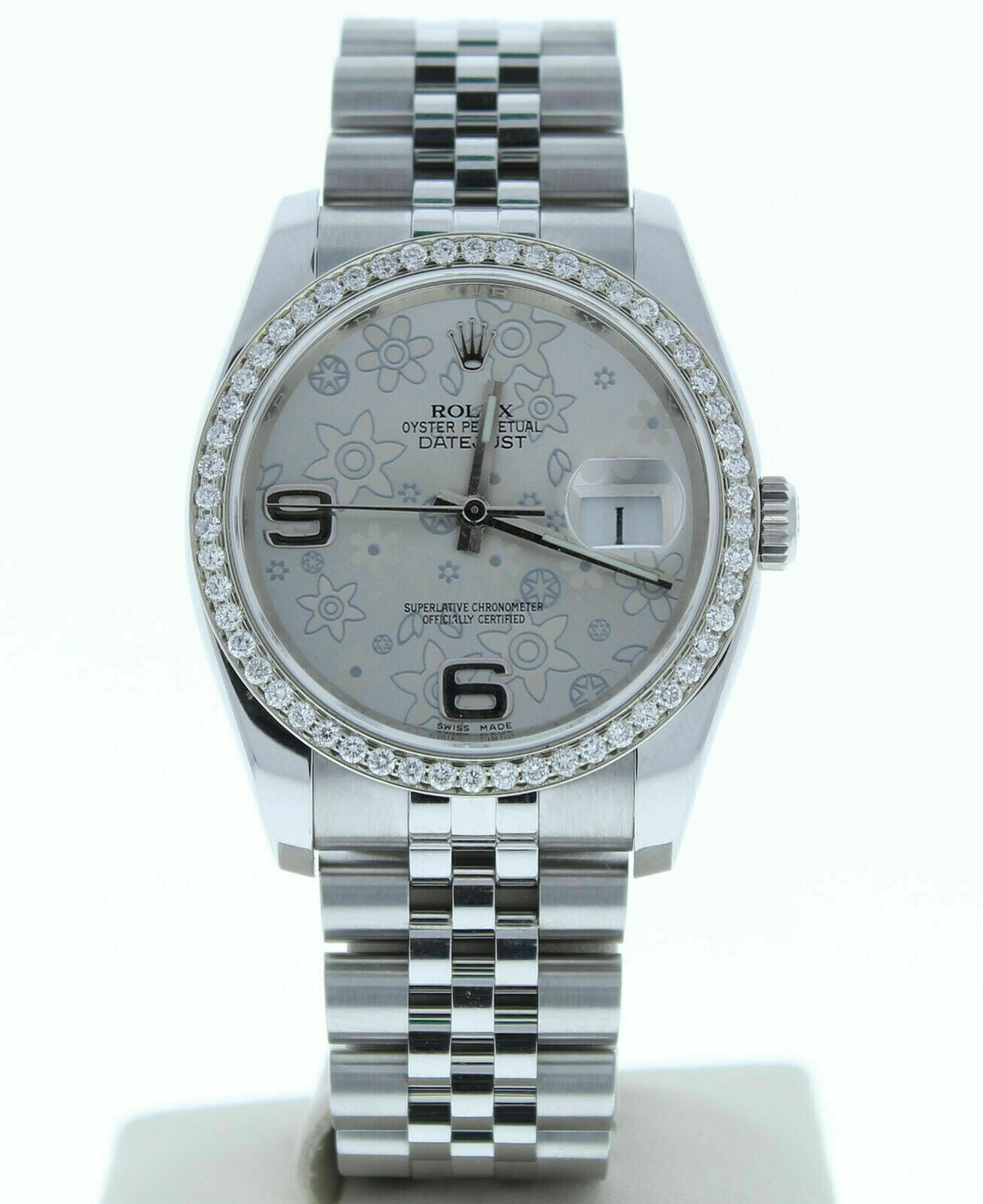 Rolex Datejust 116200 36mm Watch Silver Floral Dial & Custom 1CT Diamond Bezel