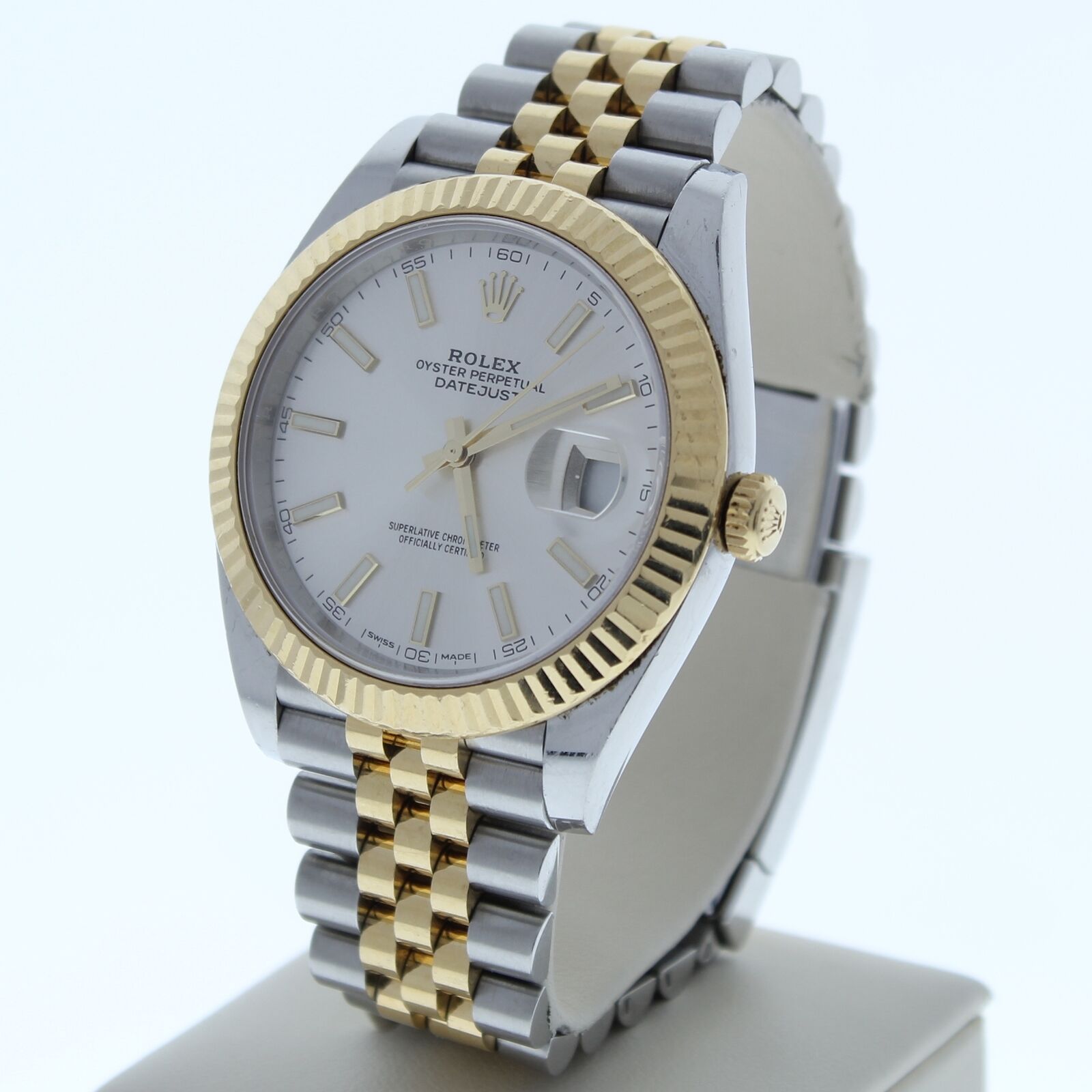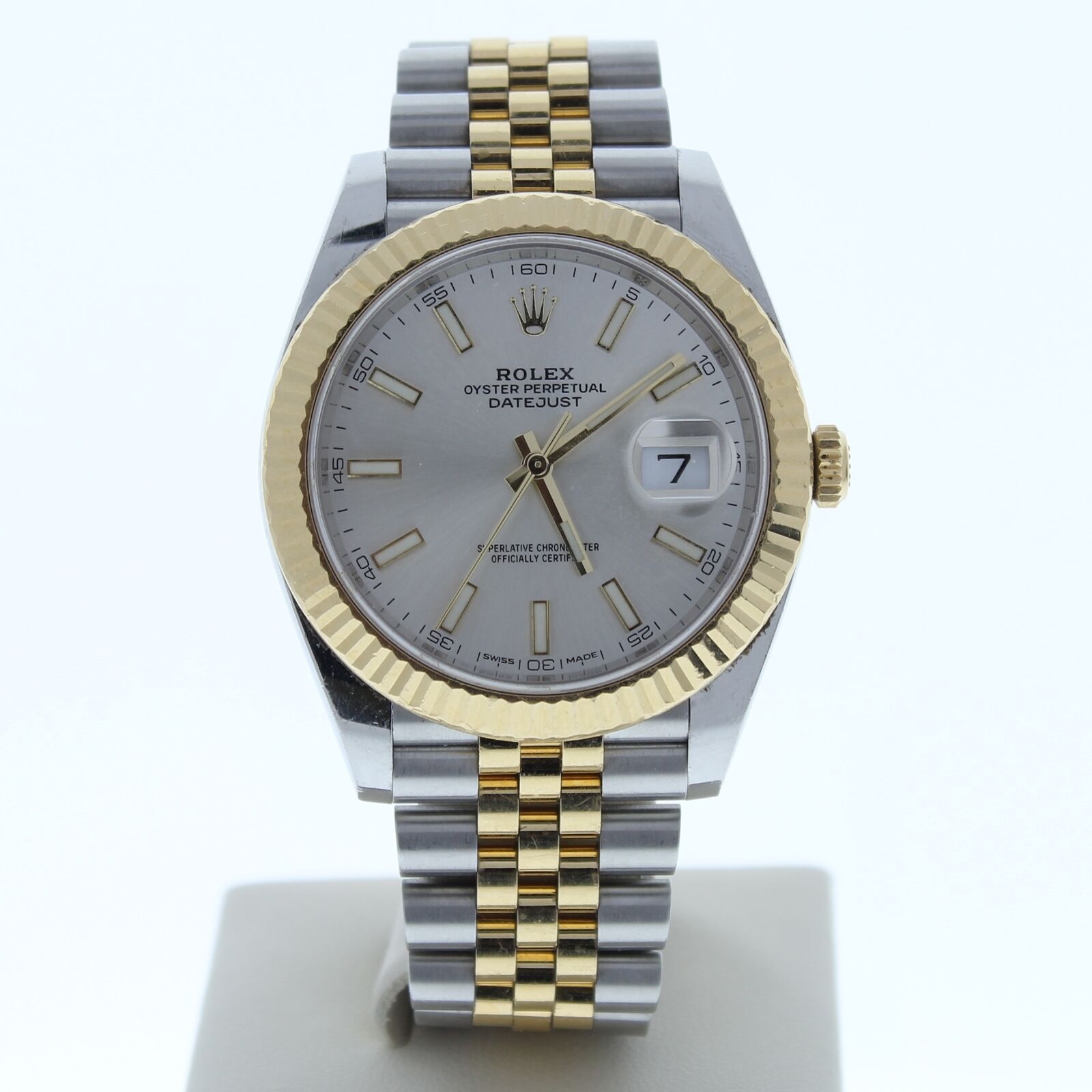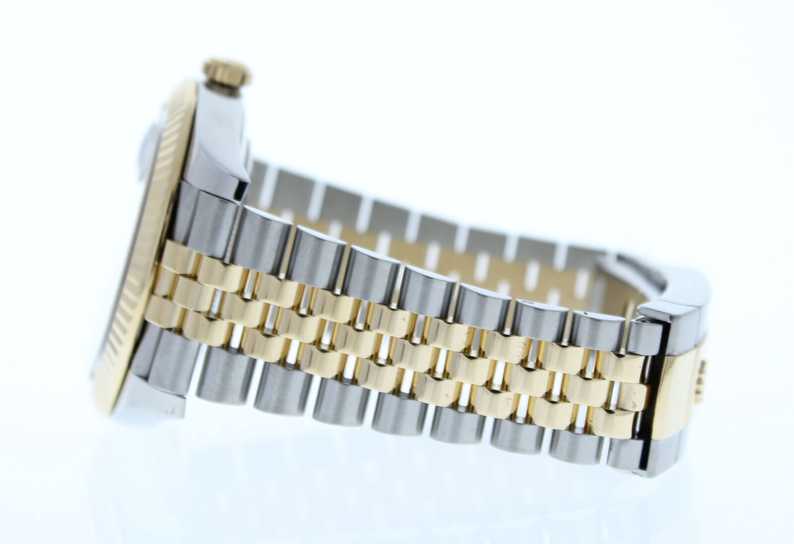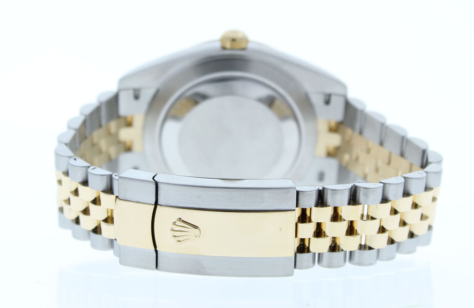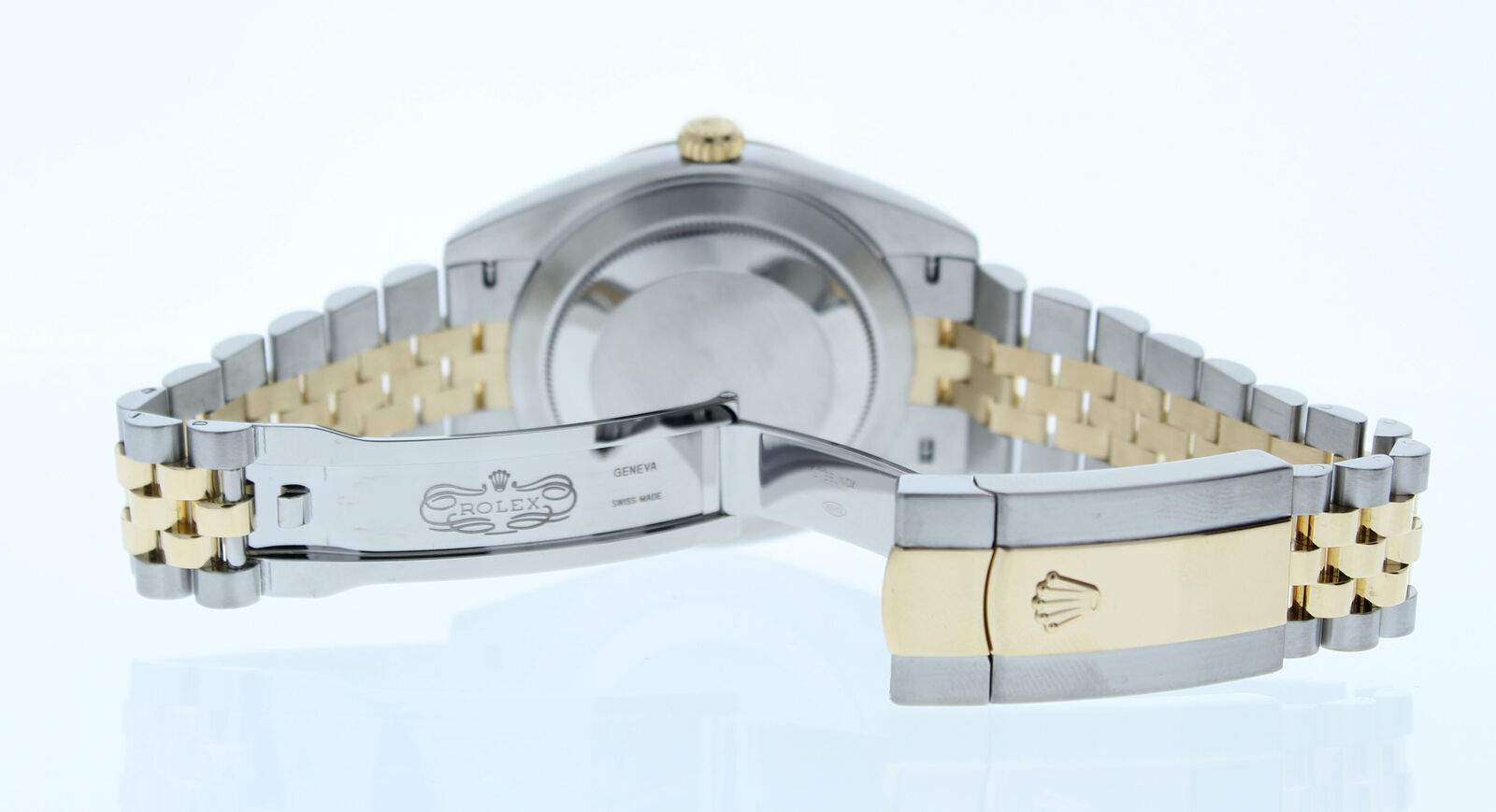 This Rolex Is Mint Condition Newstyle 41mm Datejust Steel & 18k Gold Watch Comes With Rolex Box, Booklets & Hangtag’s. This watch has been tested for accuracy and water pressure. This Watch Is Being manufactured today and comes sized for a 7 3/4″ wrist size, If you have a larger wrist please let us know and we will try to accommodate you. The watch case measures at 41mm and comes with a deployment buckle.