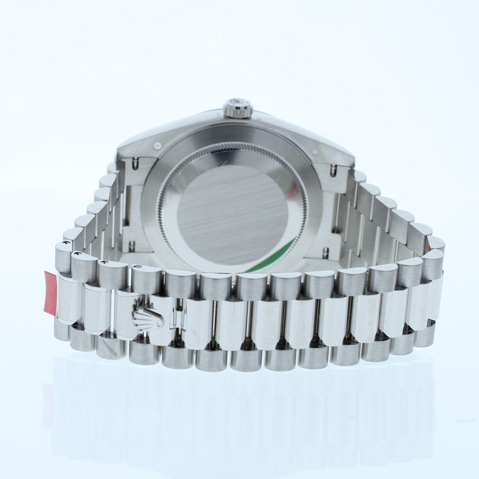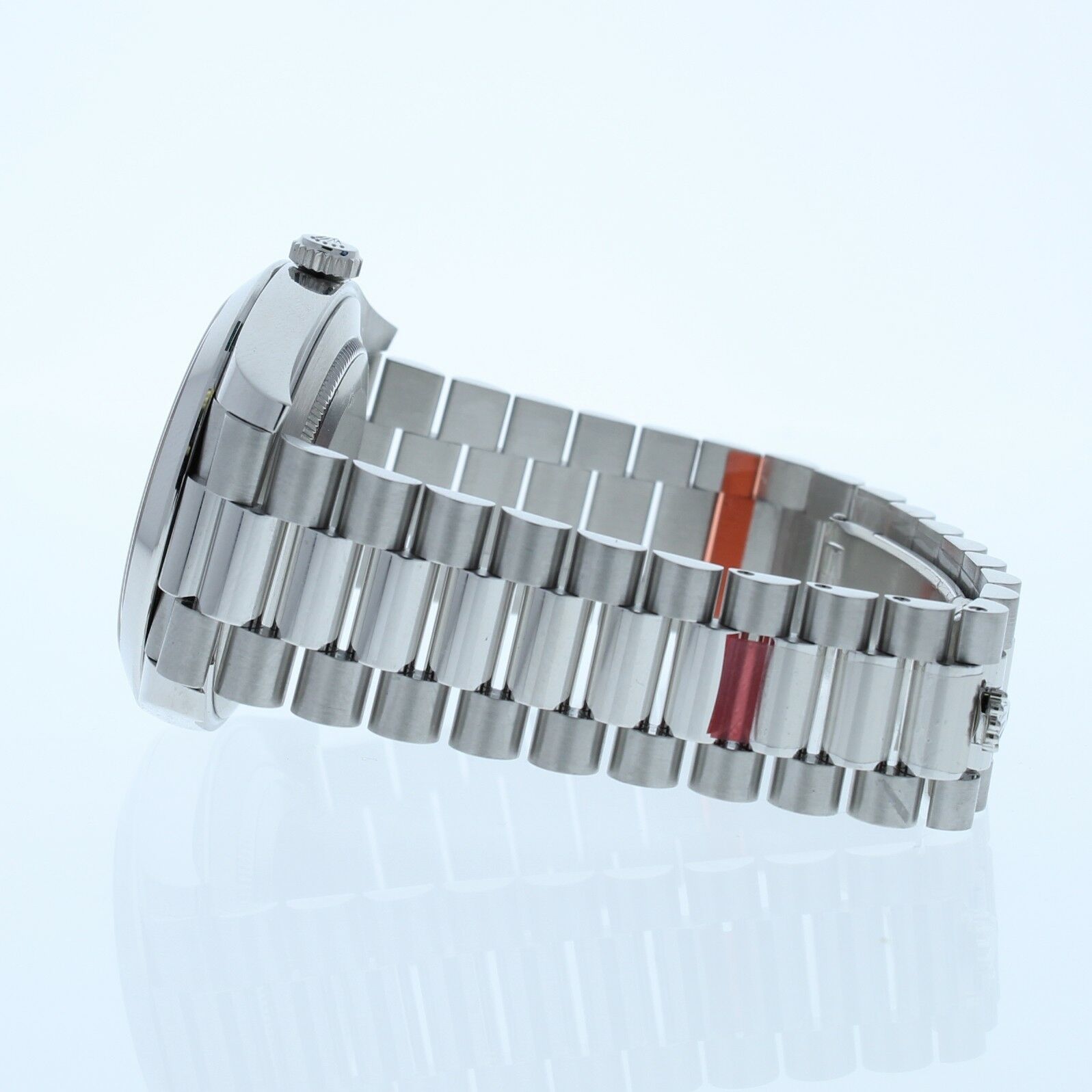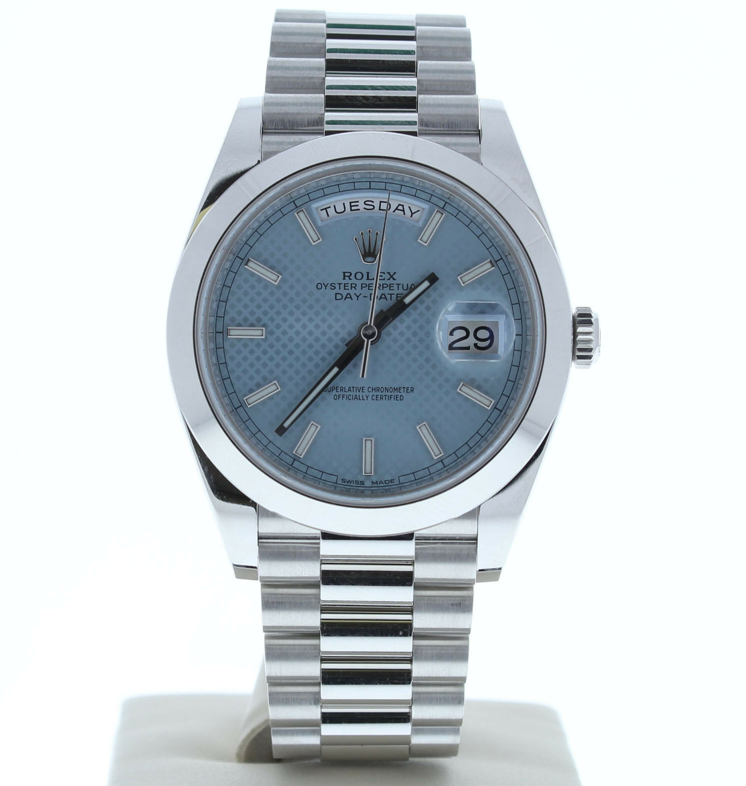 This Rolex Day Date 40mm Platinum Watch has a Blue Motif Dial, smooth bezel and a platinum presidential band that can be sized up to a 7 3/4″ wrist size, If you have a larger wrist please let us know and we will try to accommodate you. The watch case measures at 40mm and comes with a deployment buckle.
