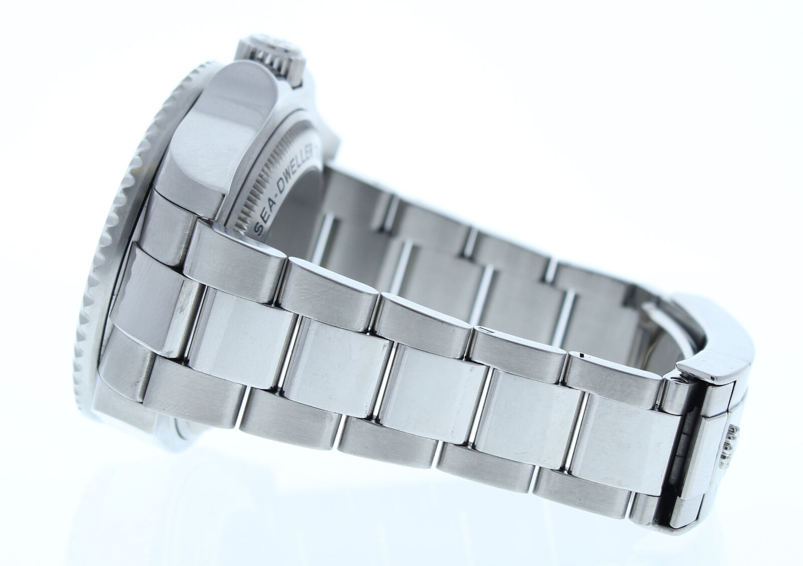 This Rolex DeepSea Dweller Watch Is In Mint Condition. It has a newstyle stainless steel oyster band that can be sized up to a 7 3/4″ wrist size, If you have a larger wrist please let us know and we will try to accommodate you. The watch case measures at 44mm and comes with the oyster foldover clasp. If you have any questions at all please feel free to contact us . We reply to all emails within 24 hours during business days.