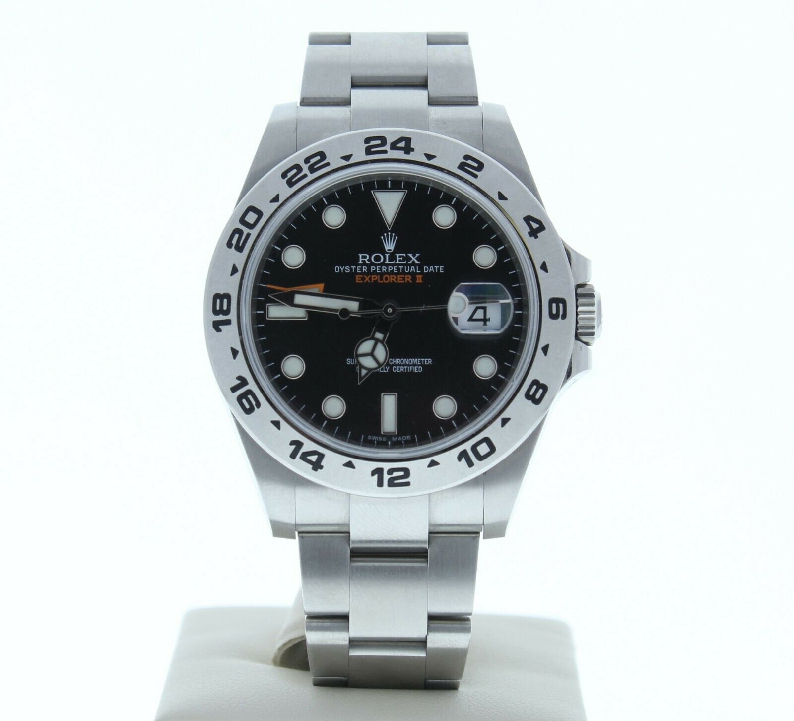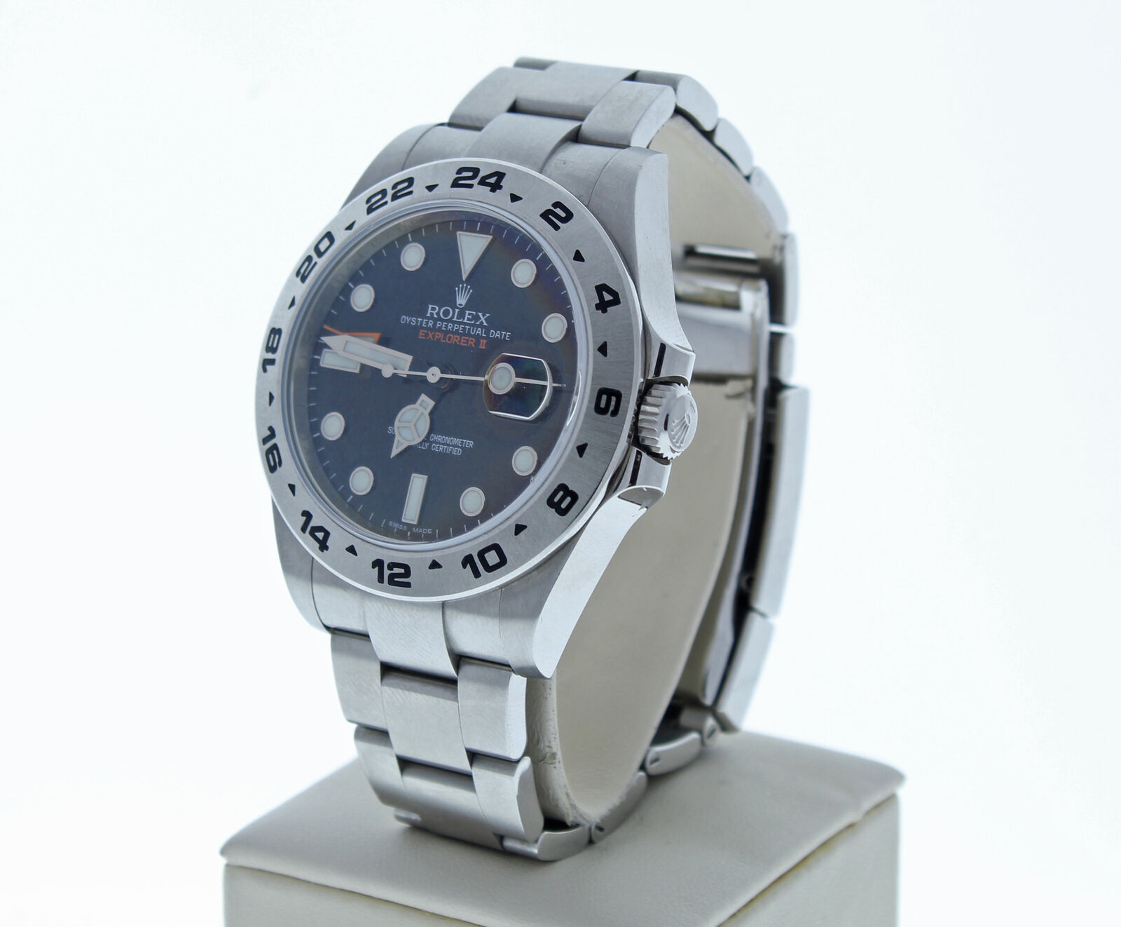 This Rolex Explorer II Newest Edition Out Model 216570 42mm Watch Black Face, Comes As Displayed In Pictures In Mint Condition. This is a newstyle watch with a oyster heavy band that fits up to a 7 3/4″ wrist size, If you have a larger wrist please let us know and we will try to accommodate you. The watch case measures at 42mm and is designed with the newstyle deployment buckle.