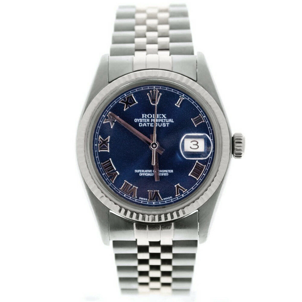 Rolex Model 16014 36mm Steel Watch Blue Roman Dial & 18k White Gold Fluted Bezel